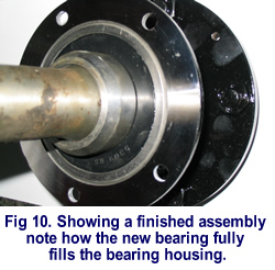 Having prepared the bearing housing it is possible now to press the bearing into the housing, taking care to only exert pressure on the OUTER bearing track. Then after making sure that the original bell shaped spacer and new spacer are both positioned on the half shaft beforehand, the shaft can be pressed through the centre of the bearing and its housing. Make sure the original bell shaped spacer is orientated correctly with its large diameter against the flange of the half shaft.